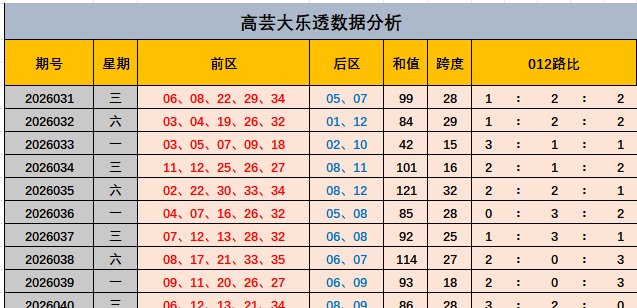大乐透2026040期开奖奖号前区06,12,13,21,34。后区08,09,前区和值86,跨度28,012路比3:2:0